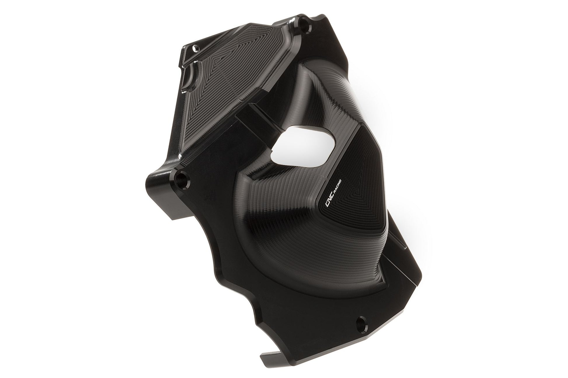 Carter pignone realizzato dal pieno in lega leggera tramite macchine CNC e successiva anodizzazione superficiale.
