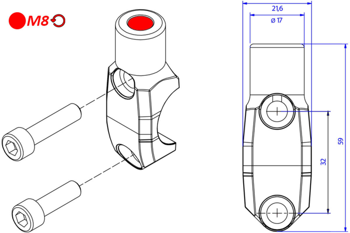 Cavallotto per pompa freno o frizione radiale Brembo OEM e RCS con foro montaggio specchio dotato di filettatura M8 sinistra, realizzato dal pieno in lega leggera tramite macchine CNC e successiva anodizzazione superficiale.
