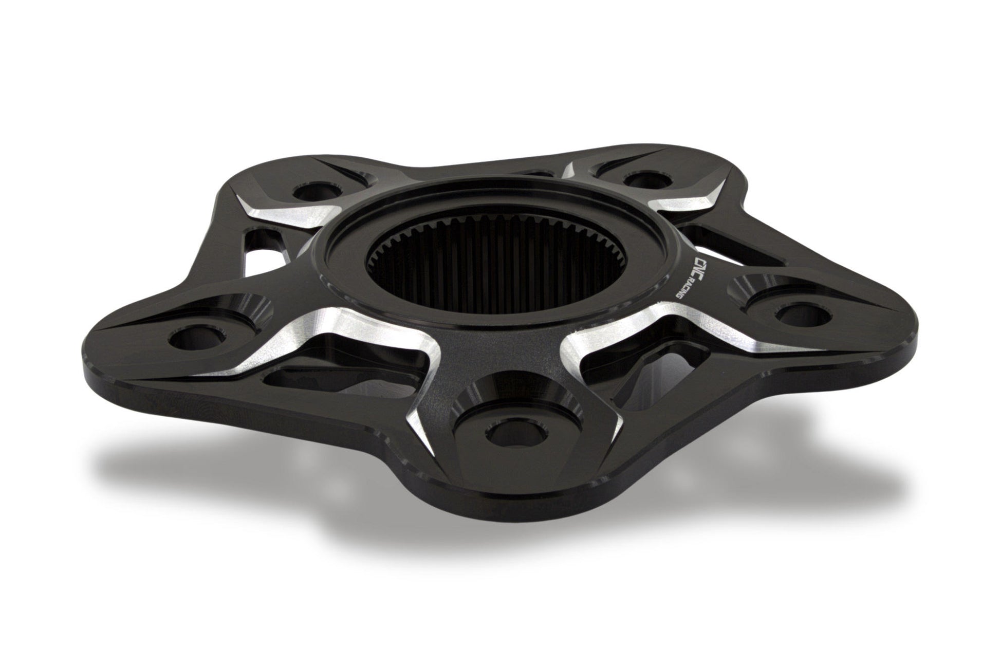 Flangia portacorona per MV Agusta lavorata dal pieno in lega leggera con successiva anodizzazione superficiale.