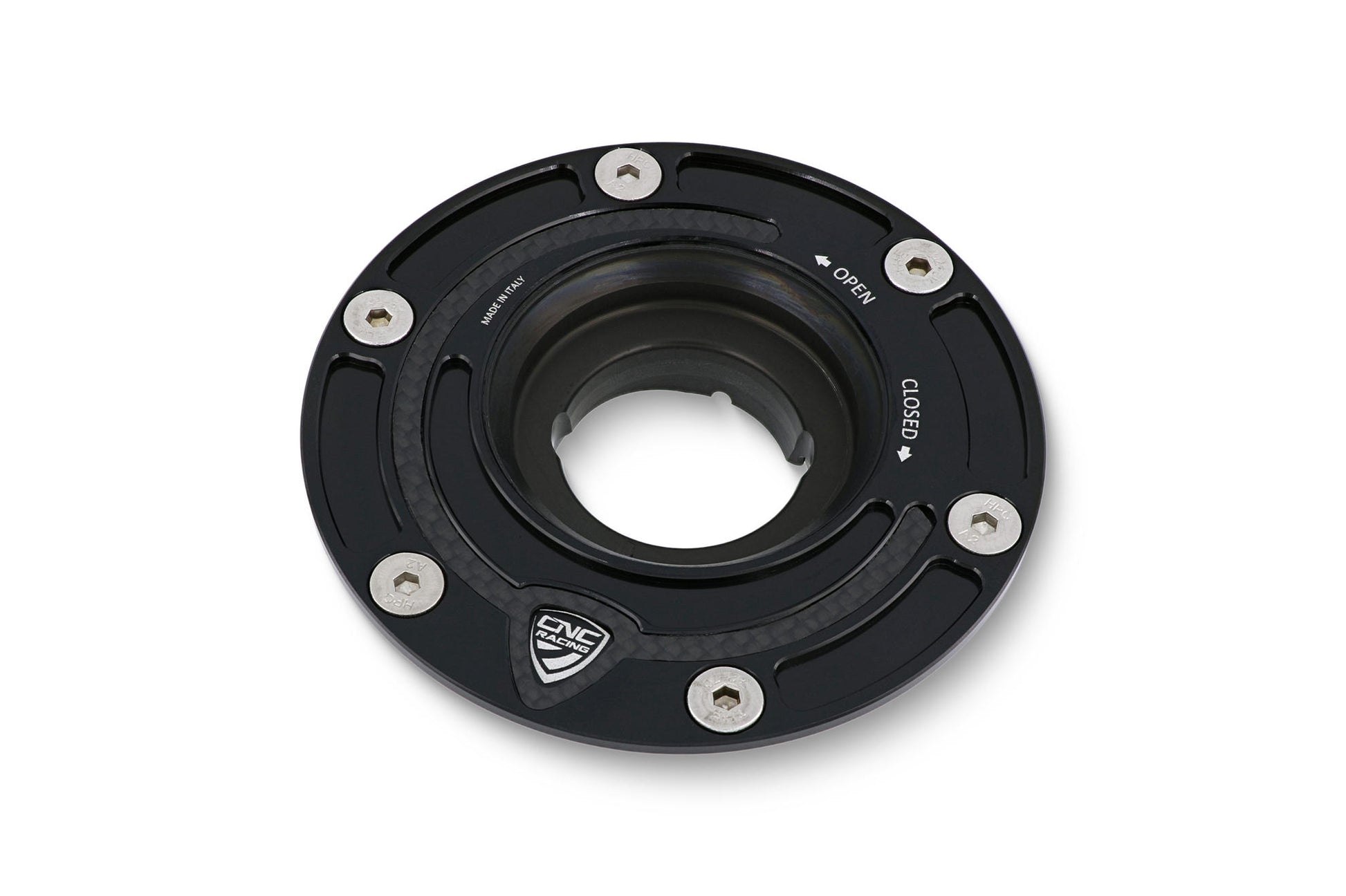 Flangia tappo serbatoio carburante lavorato dal pieno tramite macchine CNC con successiva anodizzazione superficiale. Contraddistinto da un design sportivo ed esclusivo, Ergal e carbonio si intrecciano per dare vita ad un prodotto unico e di massima qualità.