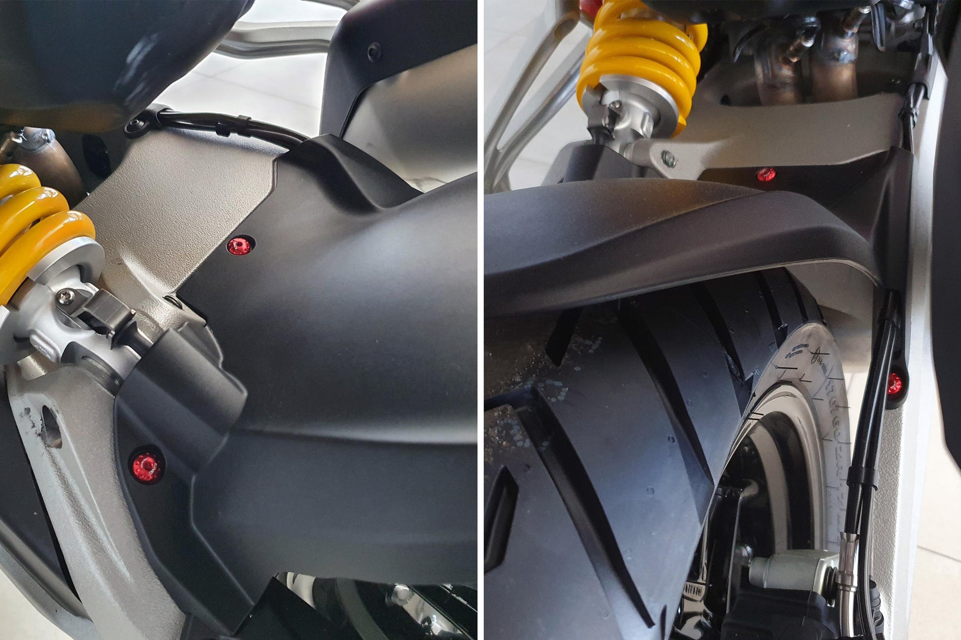 Kit vitiparafango posteriore realizzato dal pieno in lega leggera tramite macchine CNC, e successiva anodizzazione superficiale. Sostituisce l'originale donando un estetica racing e preziosa. Non necessitano modifiche per il montaggio.