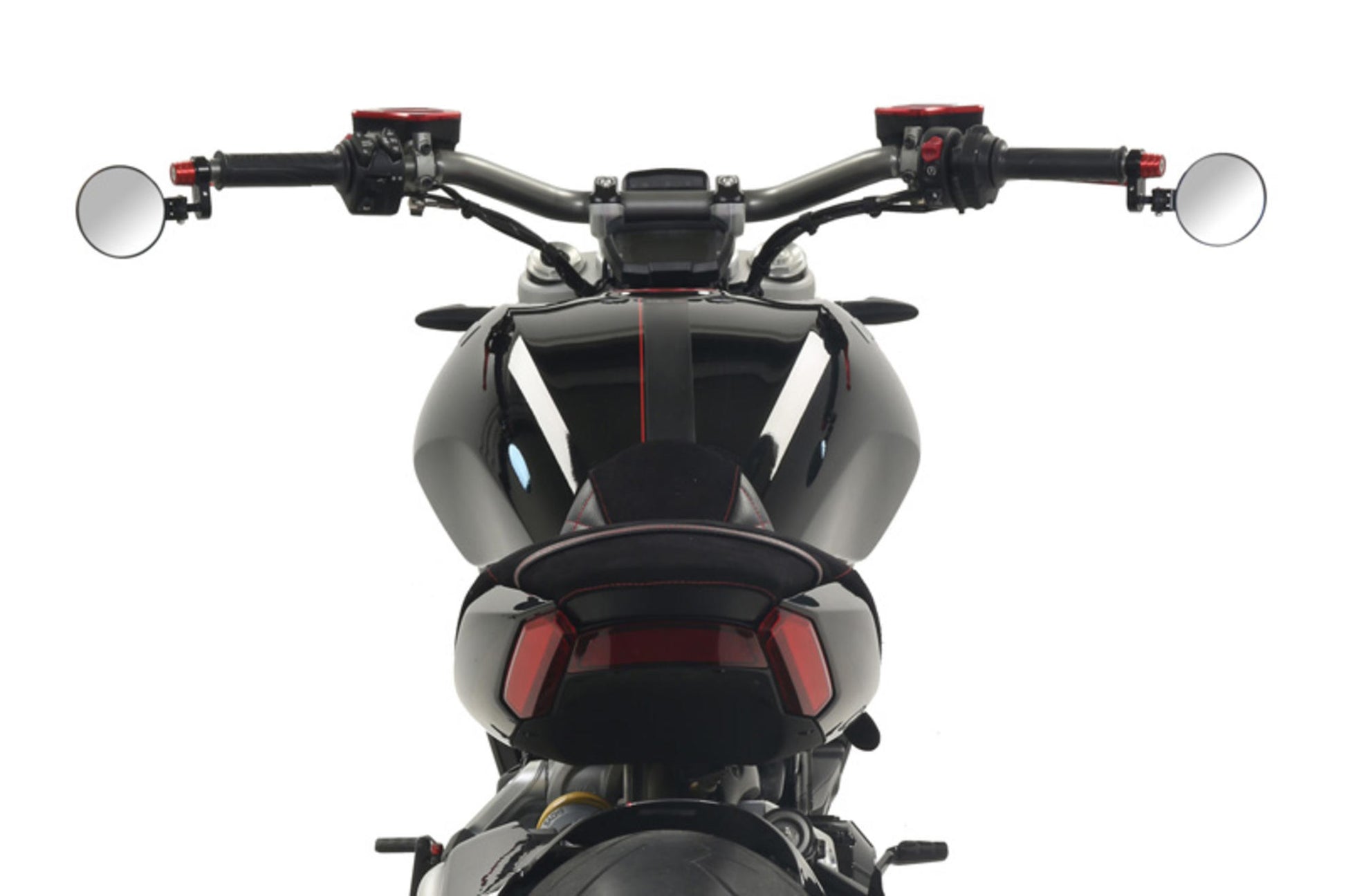 Specchietto retrovisore end-bar realizzato interamente dal pieno in lega leggera con successiva anodizzazione superficiale.