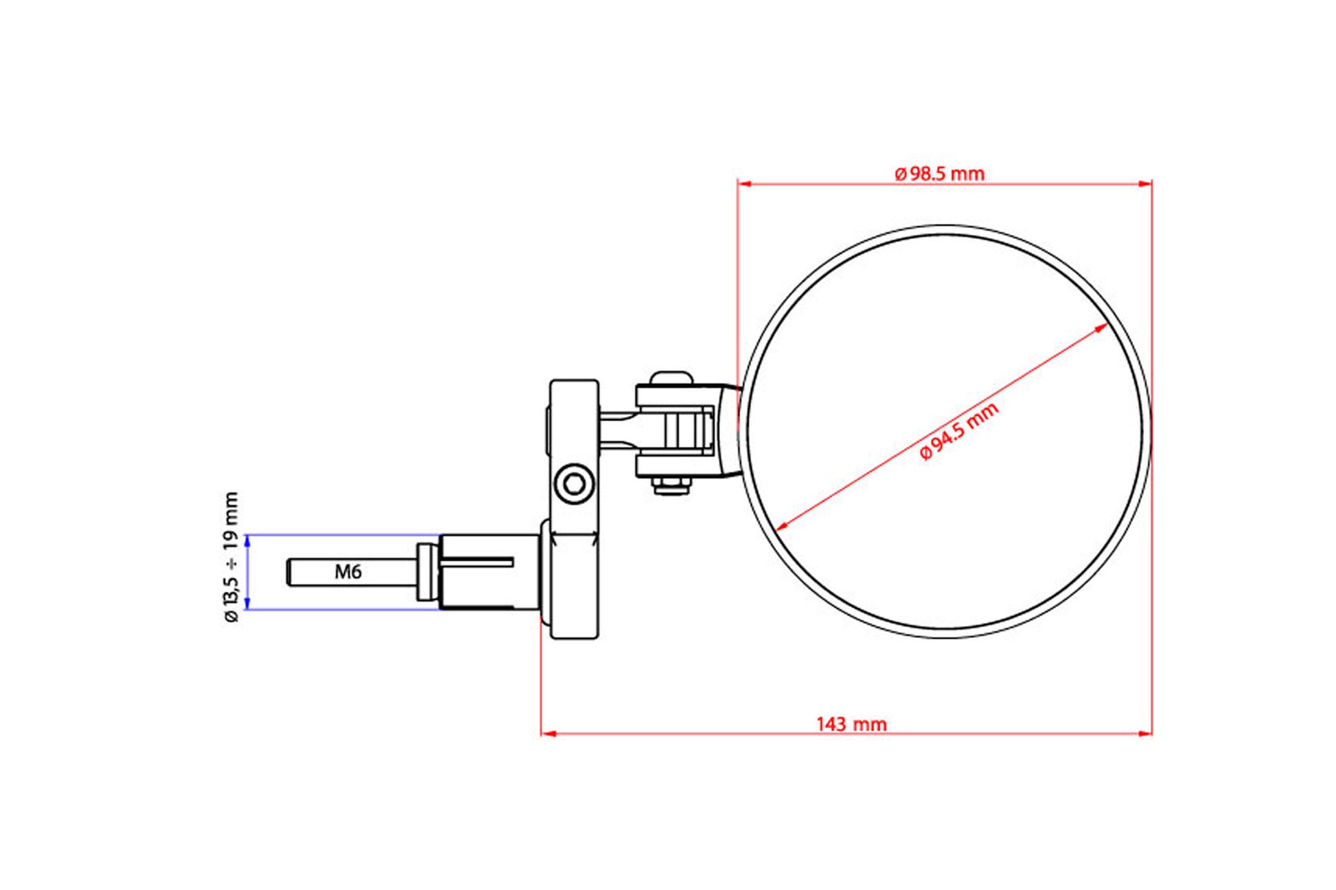 La superficie dello specchio ha un diametro di 94.5mm. e può essere montato indifferentemente in posizione alta o bassa.