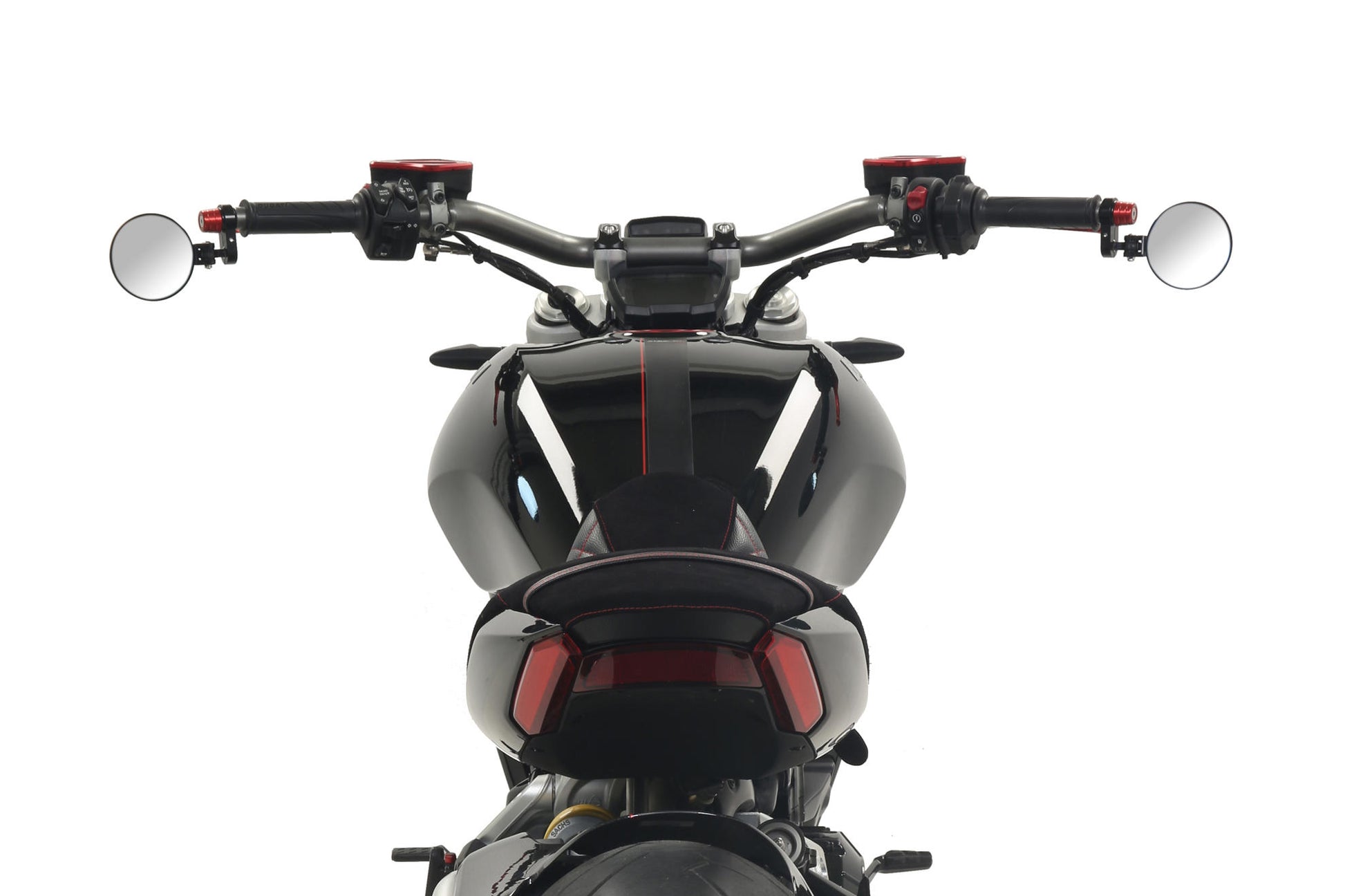 Specchietto retrovisore end-bar realizzato interamente dal pieno in lega leggera con successiva anodizzazione superficiale.