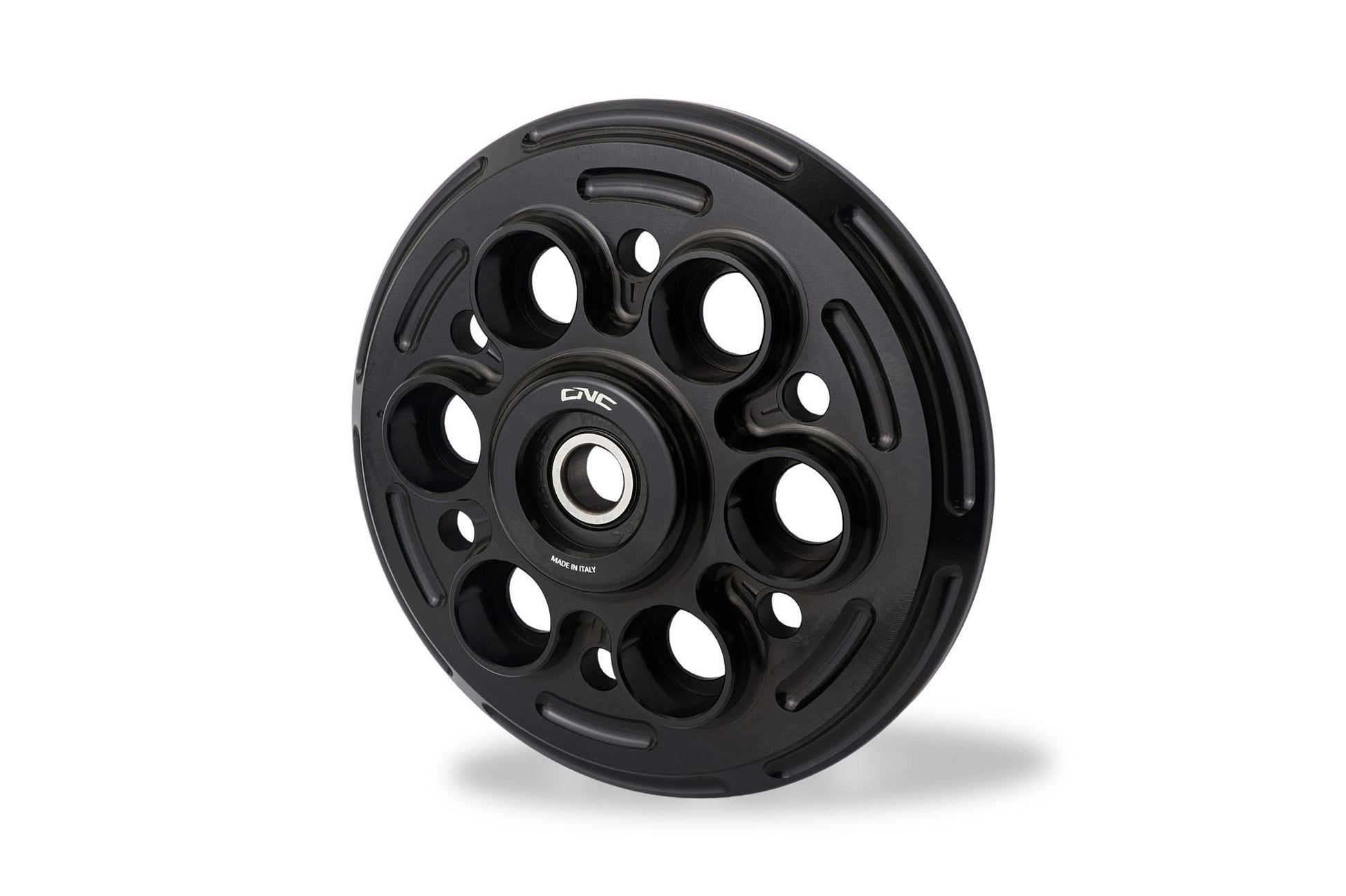 Spingidisco lavorato dal pieno in lega leggera tramite macchine a controllo numero, e successiva anodizzazione colorata superficiale.