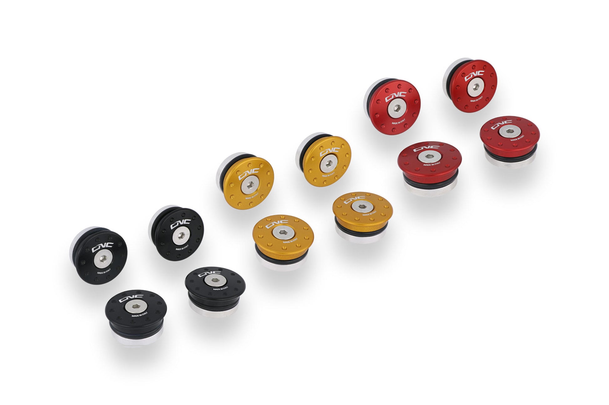 Tappi telaio realizzati dal pieno in lega leggera con successiva anodizzazione superficiale.