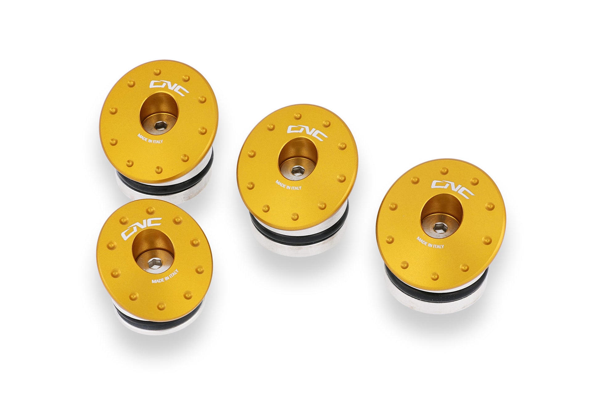 Tappi telaio realizzati dal pieno in lega leggera con successiva anodizzazione superficiale.