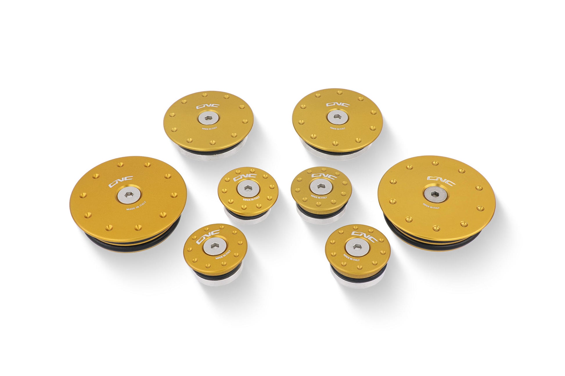 Tappi telaio realizzati dal pieno in lega leggera con successiva anodizzazione superficiale. Il kit è composto da 8 tappi ognuno nelle misure precise per adattarsi ai vari fori del telaio.
