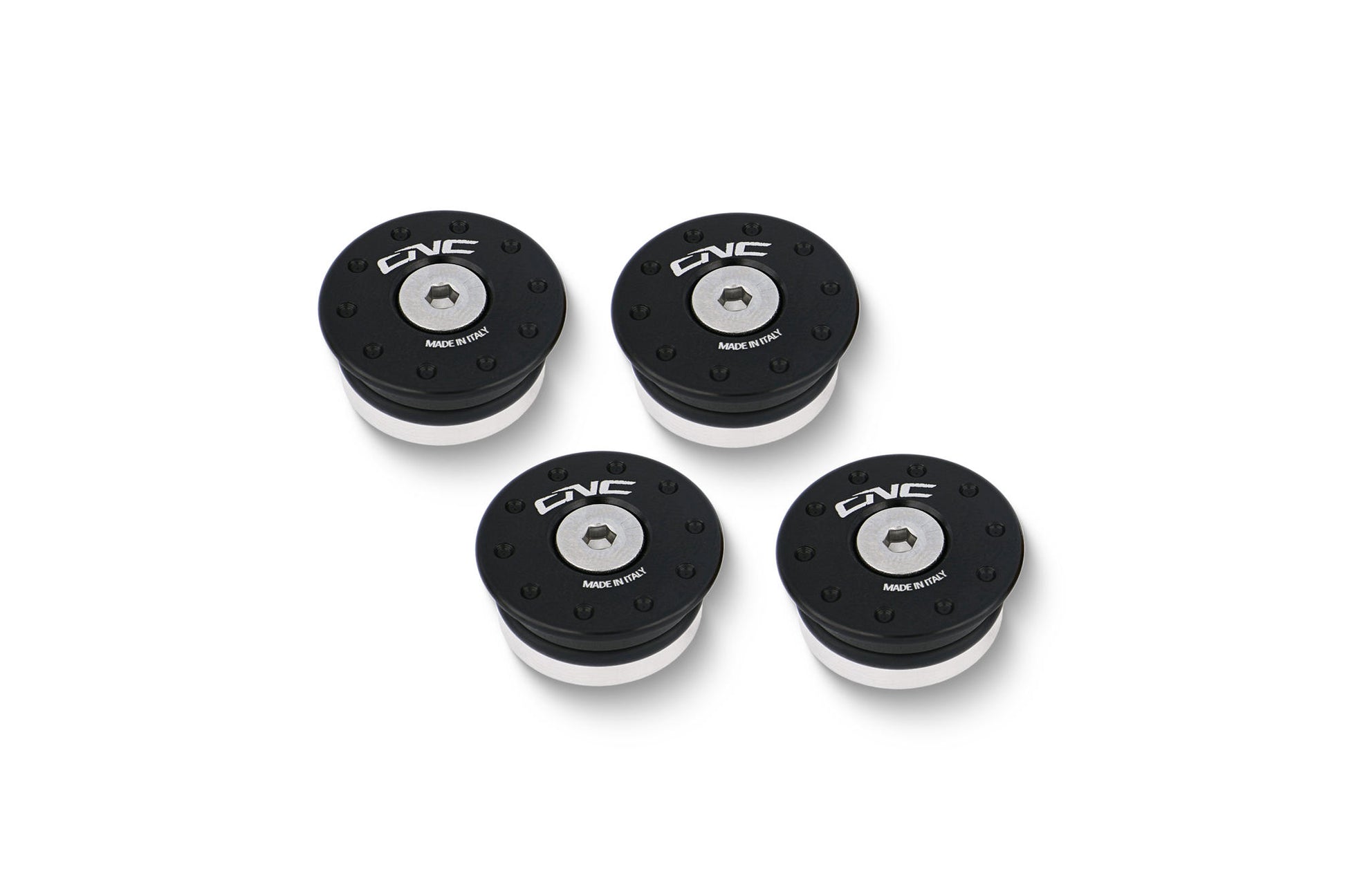 Tappi telaio realizzati dal pieno in lega leggera con successiva anodizzazione superficiale. Il kit è composto da 4 tappi ognuno nelle misure precise per adattarsi ai vari fori del telaio.