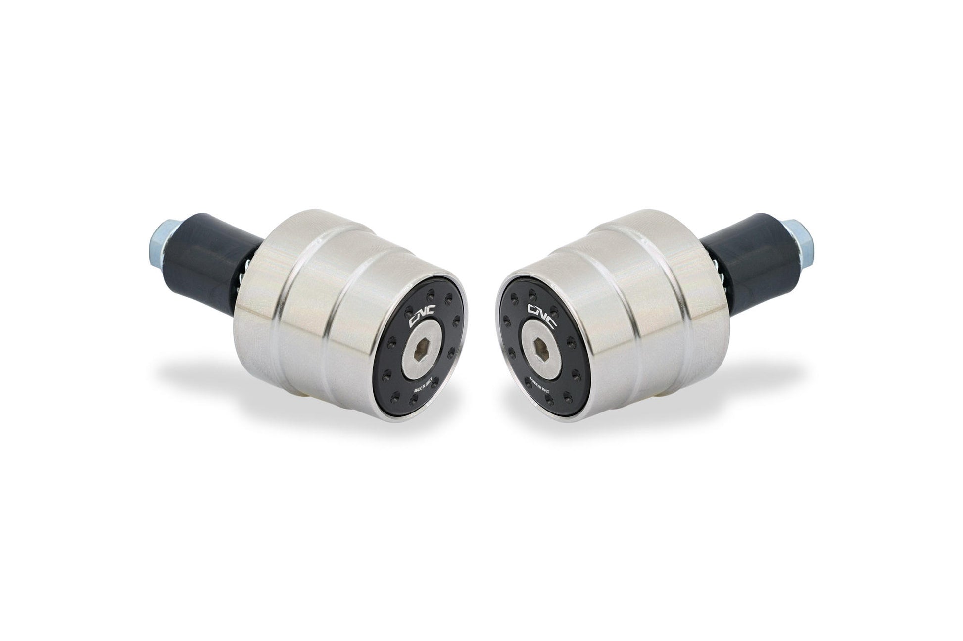 Contrappesi manubrio realizzati dal pieno in Acciaio Inox tramite macchine CNC. I tappi esterni realizzati in alluminio con successiva anodizzazione colorata donano un estetica accattivante.