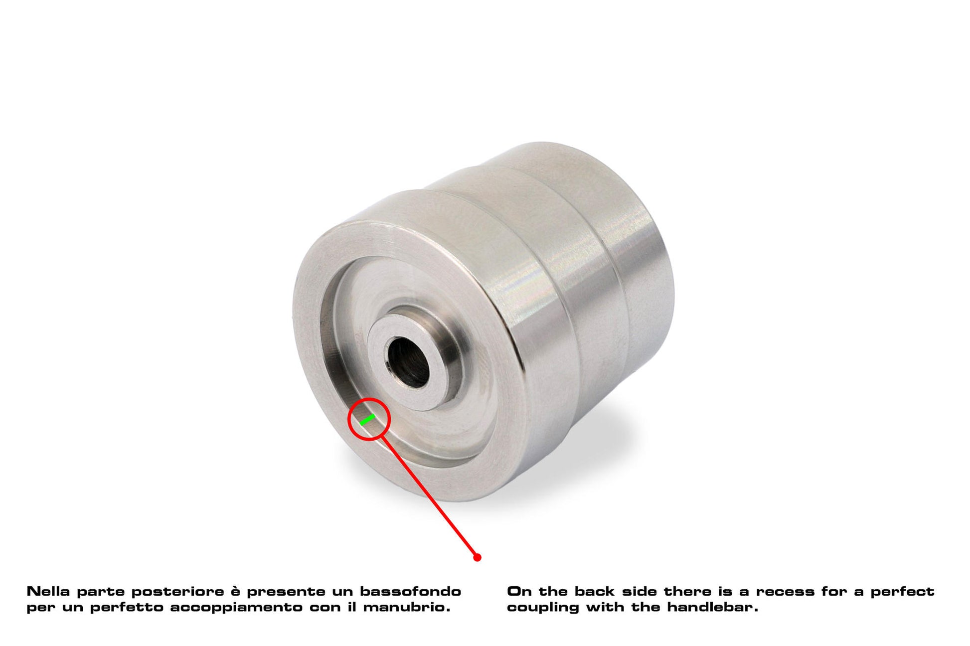Contrappesi manubrio realizzati dal pieno in Acciaio Inox tramite macchine CNC. I tappi esterni realizzati in alluminio con successiva anodizzazione colorata donano un estetica accattivante.
