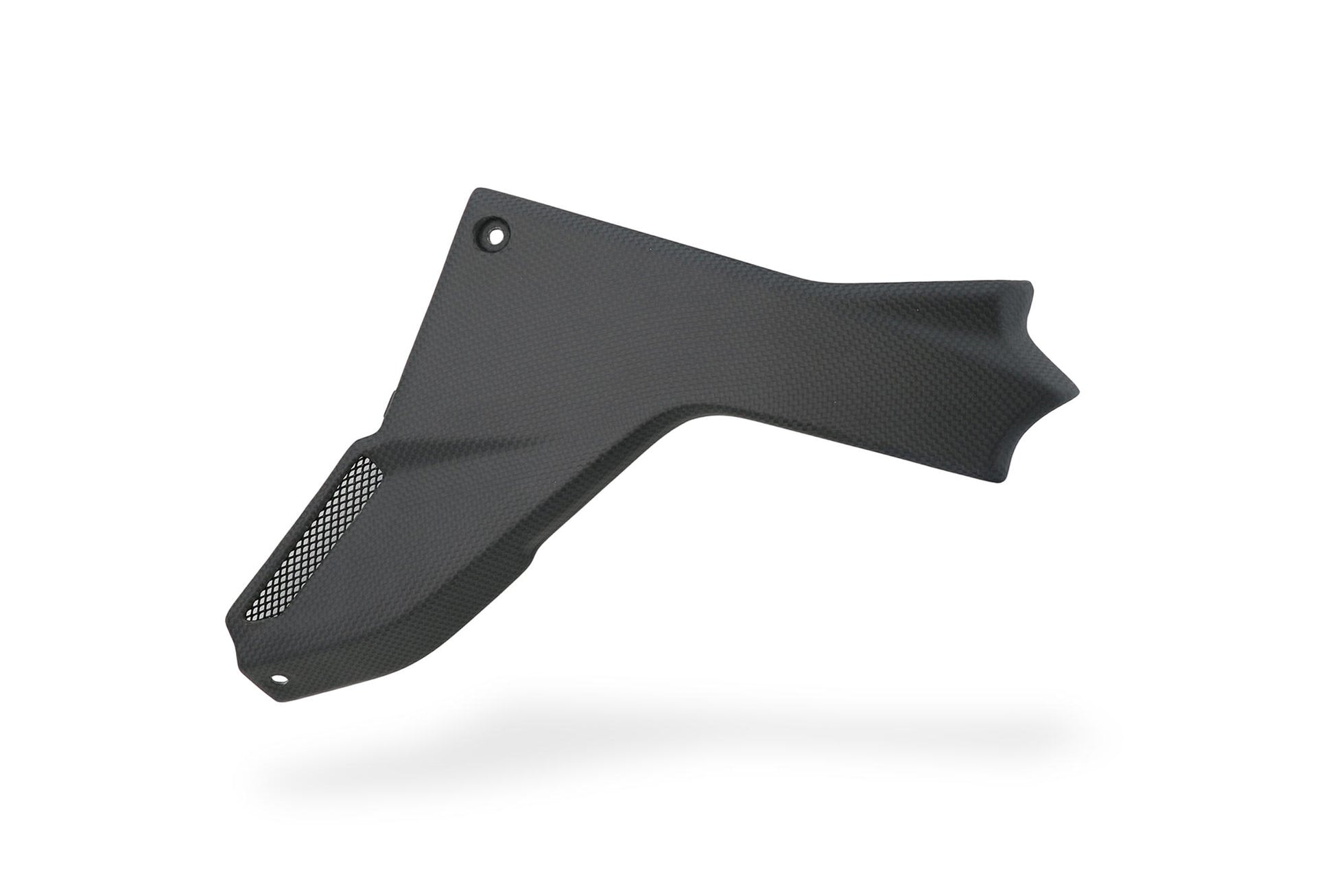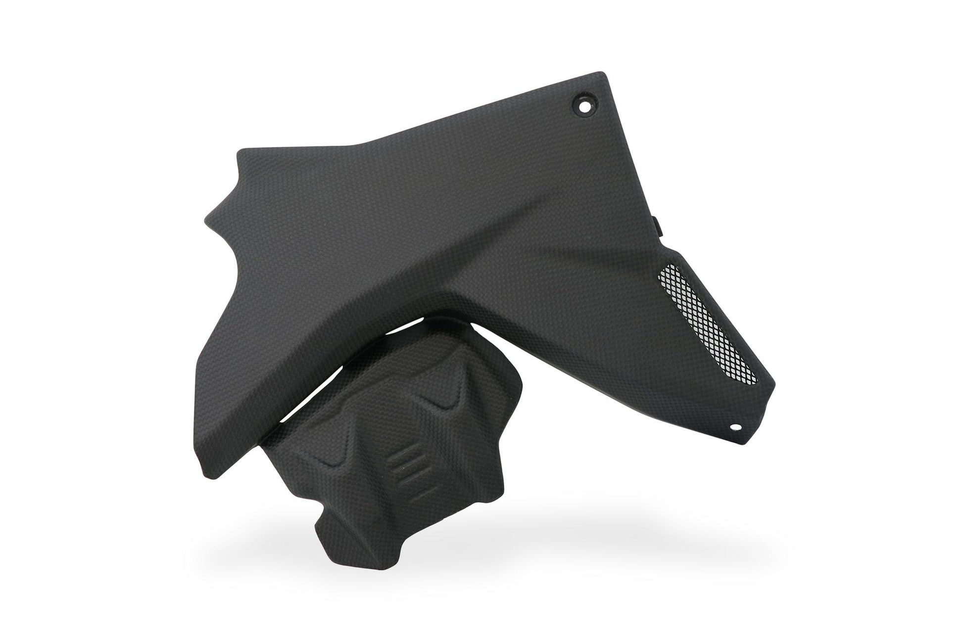 Cover laterali motore per la Multistrada V4 realizzati in fibra di carbonio con trama plain e finitura opaca;