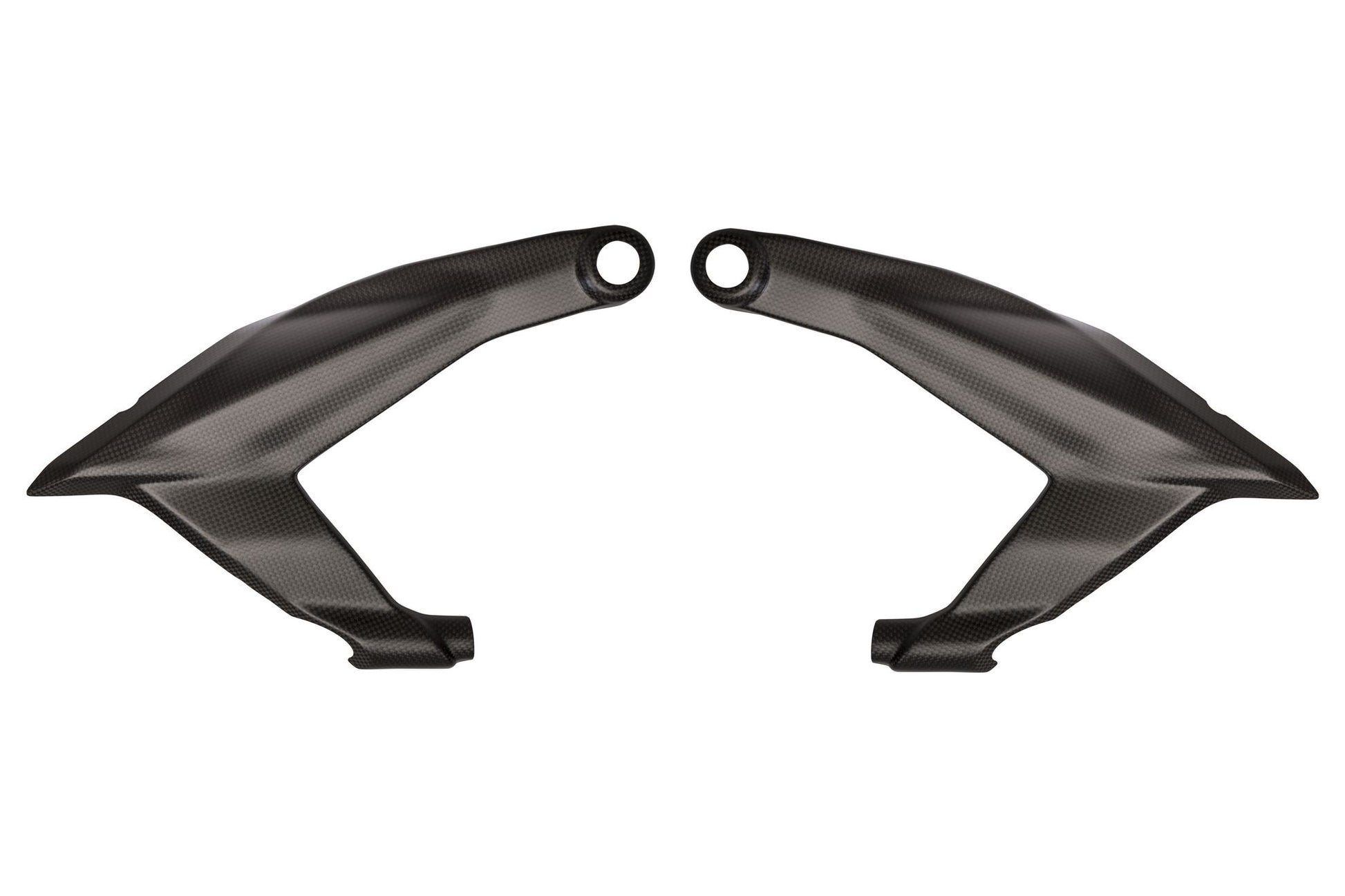 Cover telaio Ducati Panigale, lato destro e sinistro, realizzati a mano in fibra di carbonio 100%, trama plain e finitura opaca.