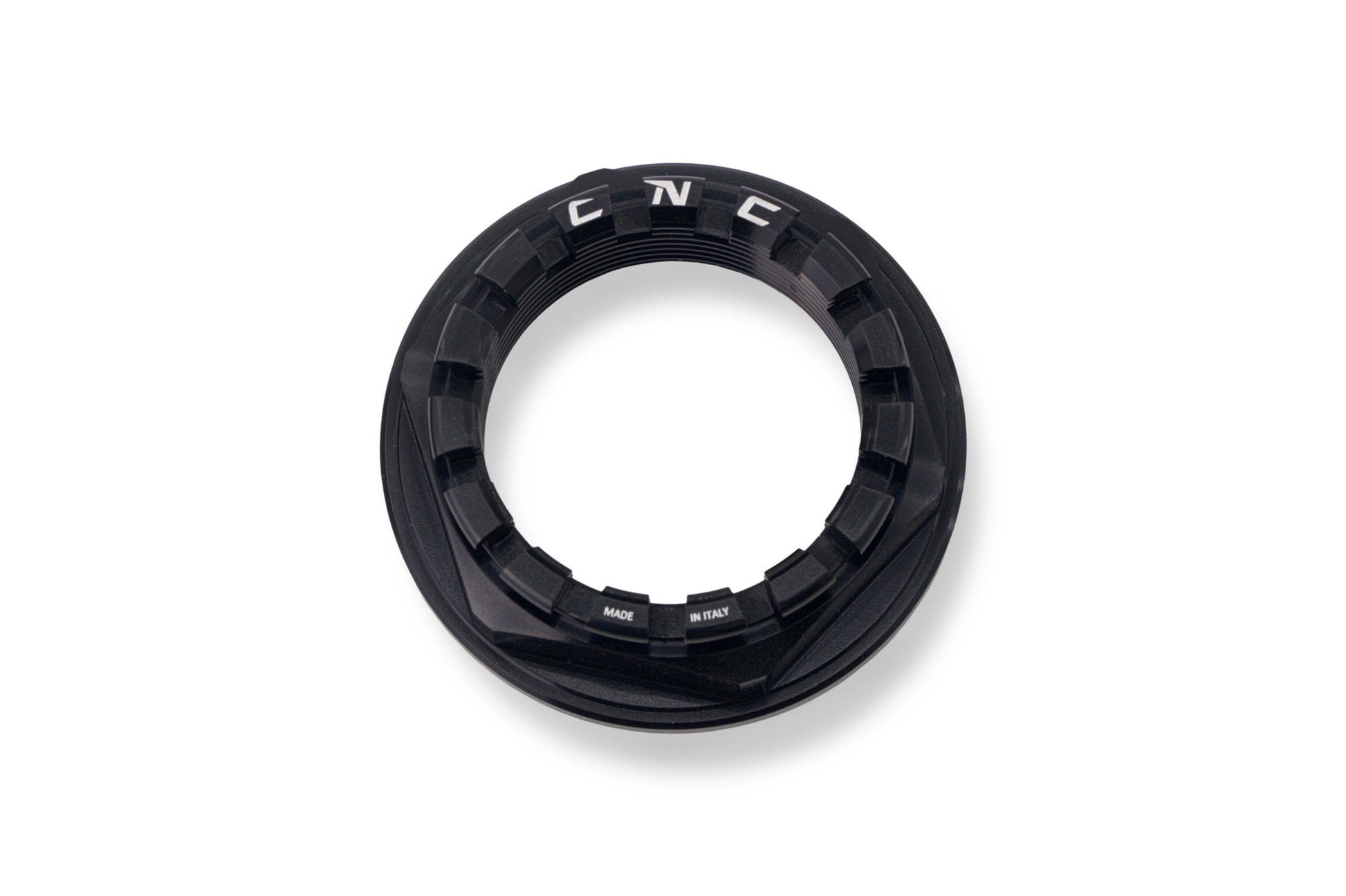 Dado ruota posteriore lato sinistro lavorato dal pieno in lega leggera con successiva anodizzazione superficiale.