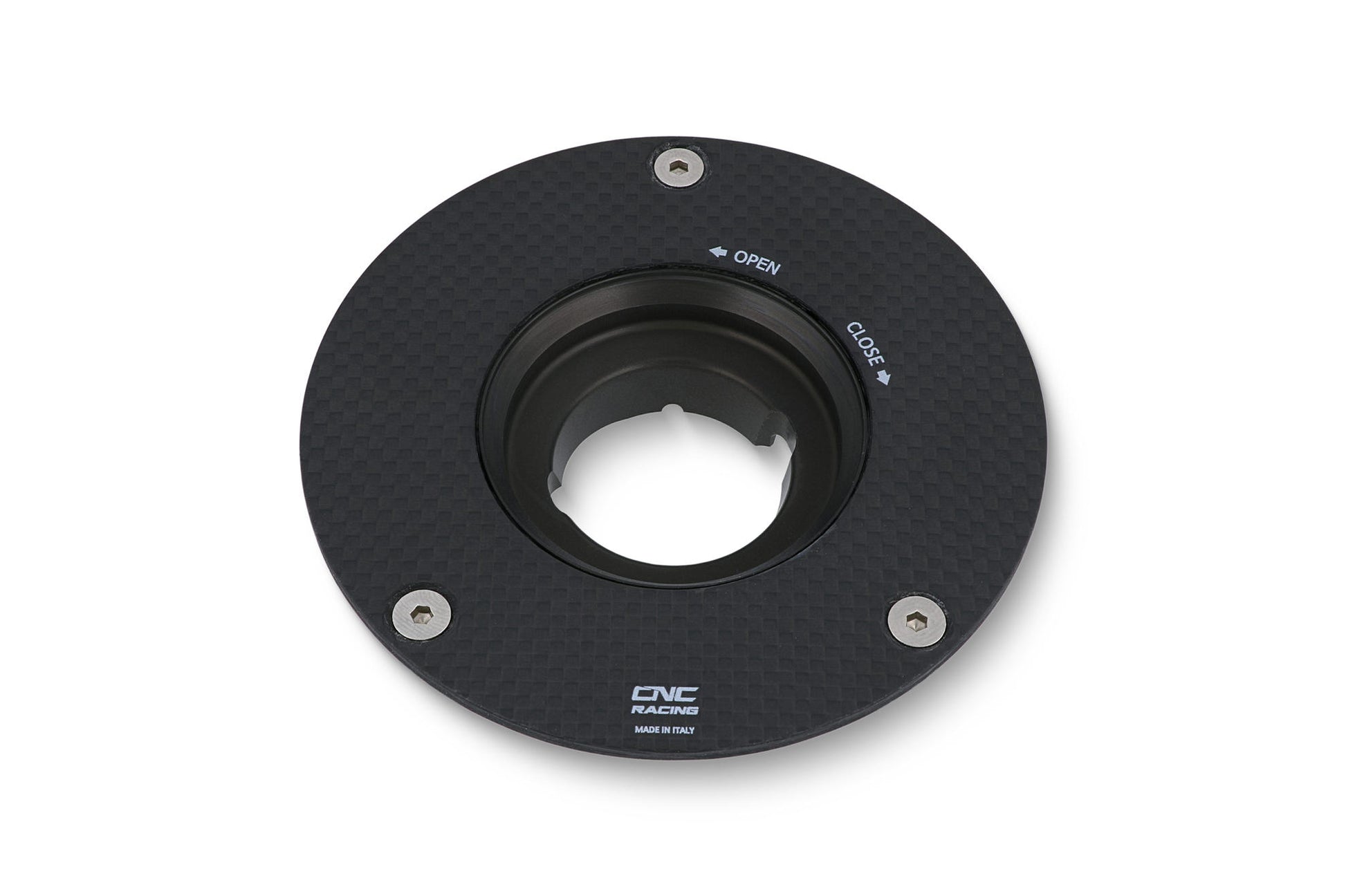Flangia serbatoio carburante in carbonio con trama plain e finitura opaca o lucida; prodotto in carbonio 100% lavorato in autoclave, sostituisce senza modifiche l'originale.