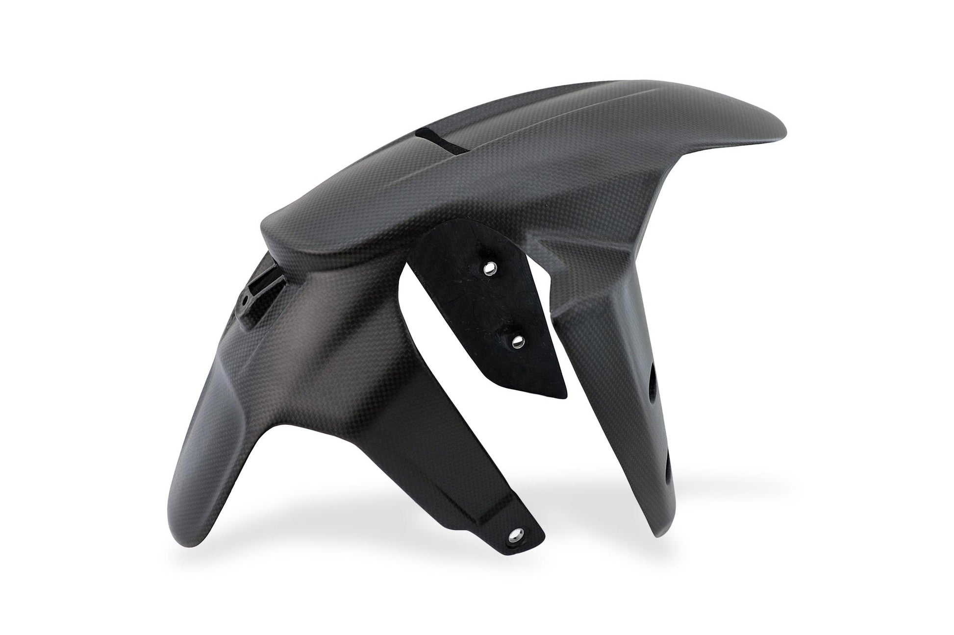 Parafango anteriore per la Multistrada V4 realizzato in fibra di carbonio con trama plain e finitura opaca;