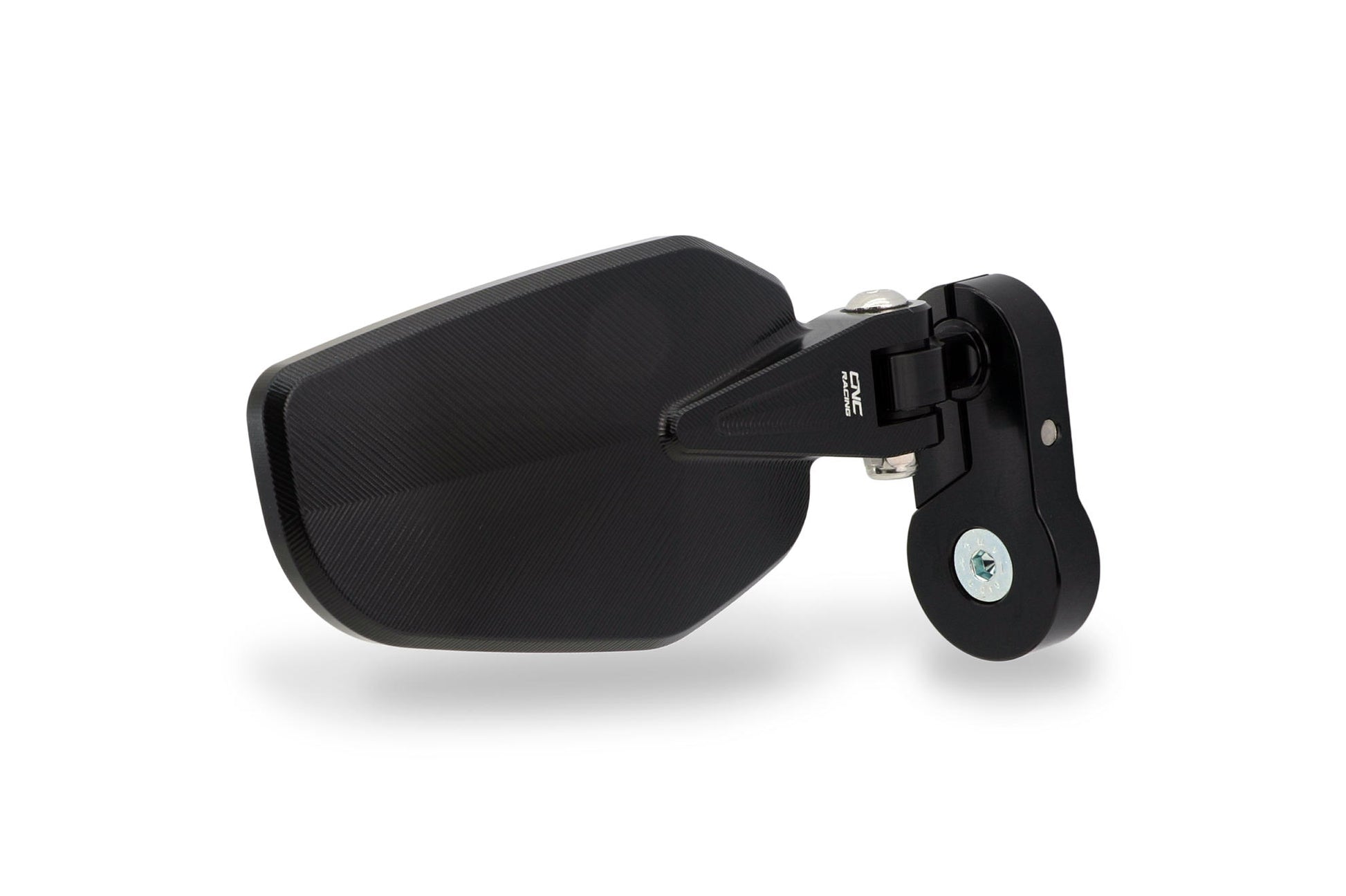Specchietto retrovisore end-bar realizzato interamente dal pieno in lega leggera con successiva anodizzazione superficiale.