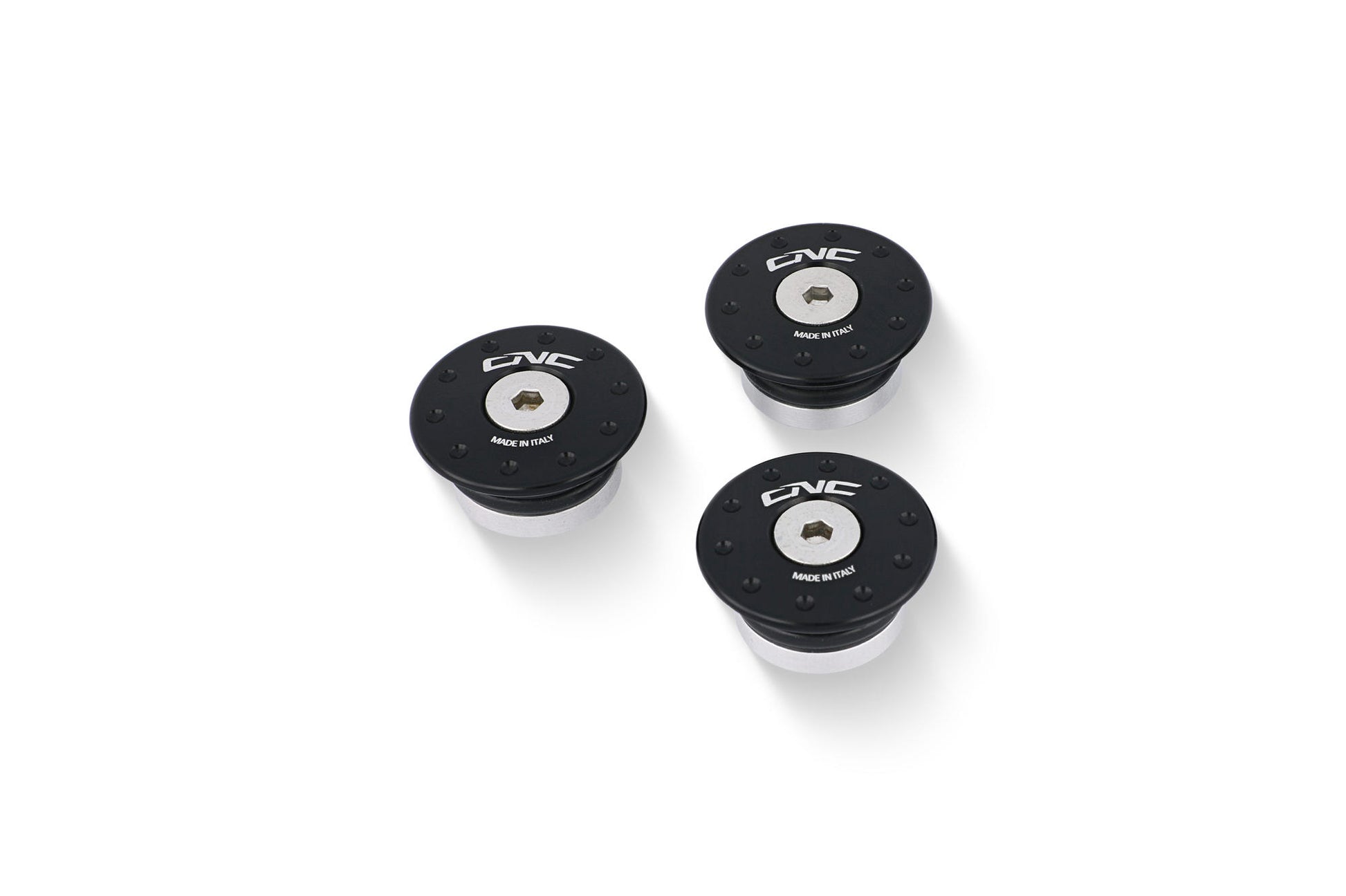 Tappi telaio realizzati dal pieno in lega leggera con successiva anodizzazione superficiale. Il kit è composto da 3 tappi ognuno nelle misure precise per adattarsi ai vari fori del telaio.