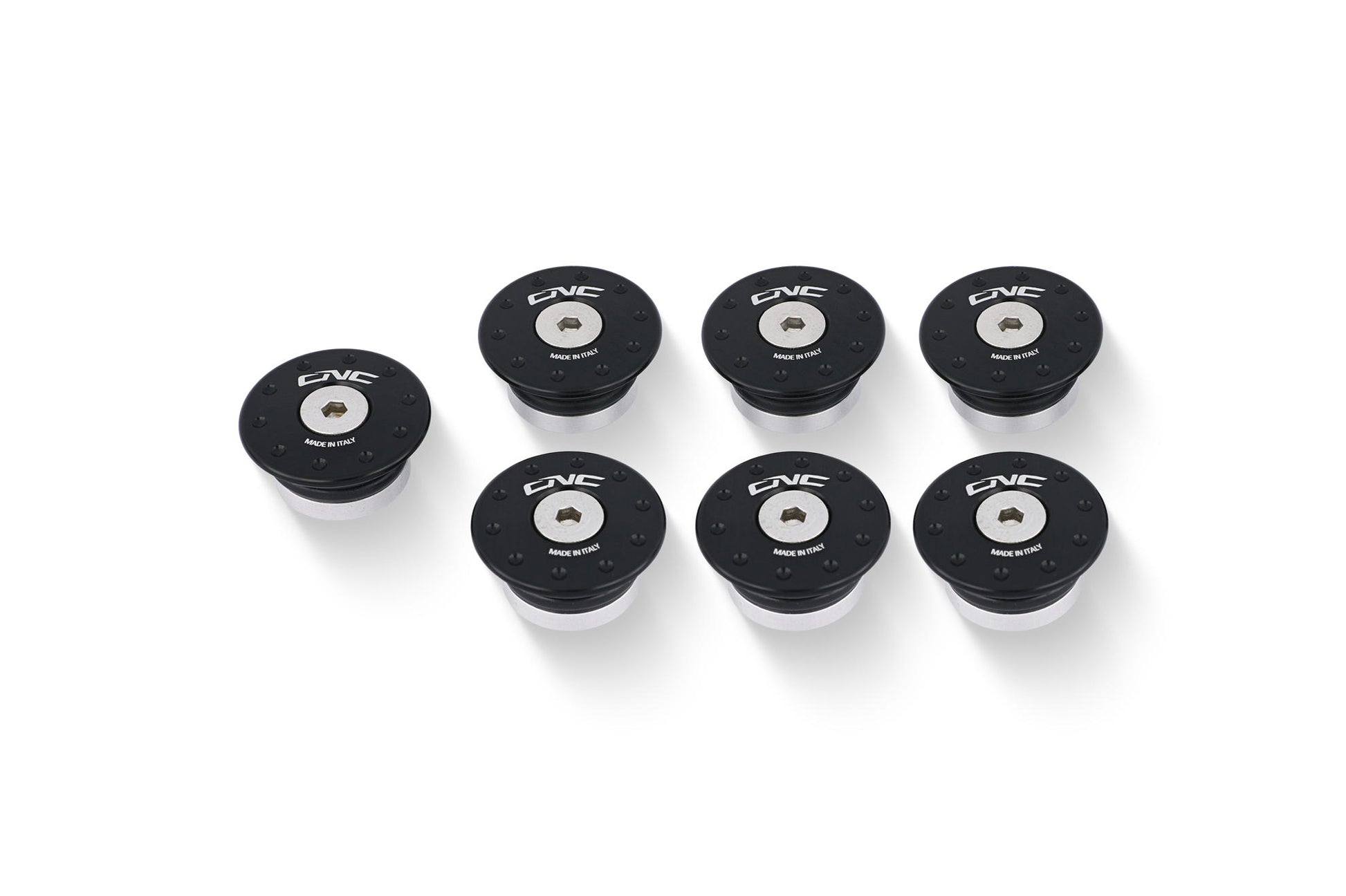 Tappi telaio realizzati dal pieno in lega leggera con successiva anodizzazione superficiale. Il kit è composto da 7 tappi ognuno nelle misure precise per adattarsi ai vari fori del telaio.